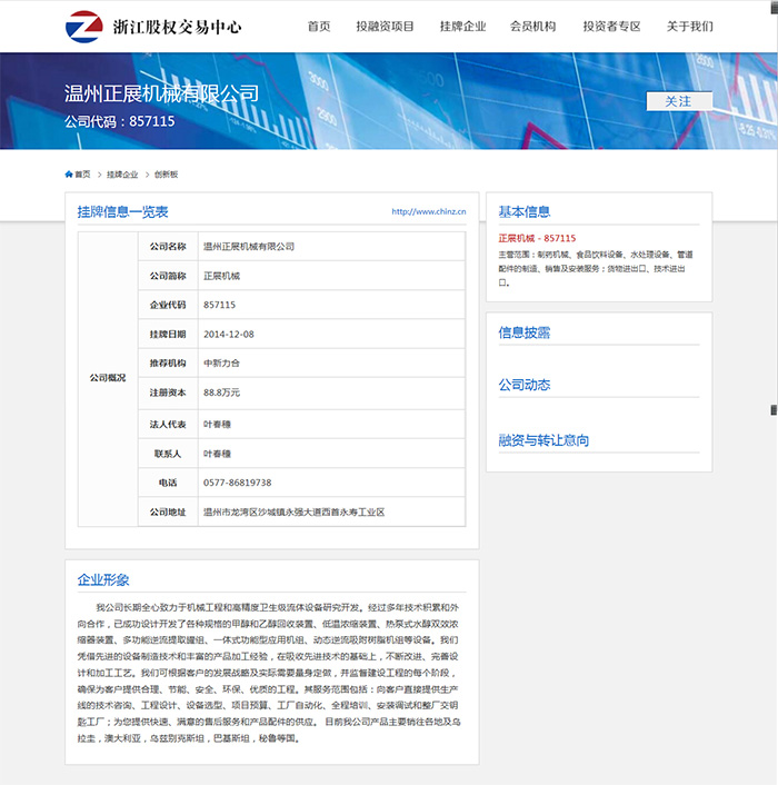正展機(jī)械2014年12月8日在浙江股權(quán)交易中心正式掛牌
